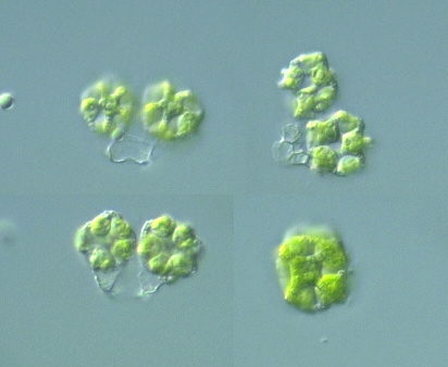 Coelastrum cambricum Archer var. cambricum: Colonies of 8, 16, 32 or 64 cells, spherical in shape; cells spherical, covered by a delicate gelatinous sheath; sheaths with 5 or 6 short, stout, truncate processes radially projected and a single process toward the outer face of the cell; cells connected to adjacent ones by marginal processes of the sheath; intercellular spaces circular or triangular; cells 6-21 μm diam. (Photomicrographs of the Freshwater Algae, 1996).