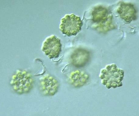 Species: Colonies of 8, 16, 32 or 64 cells, spherical in shape; cells spherical, covered by a delicate gelatinous sheath; sheaths with 5 or 6 short, stout, truncate processes radially projected and a single process toward the outer face of the cell; cells connected to adjacent ones by marginal processes of the sheath; intercellular spaces circular or triangular; cells 6-21 μm diam. (Photomicrographs of the Freshwater Algae, 1996).