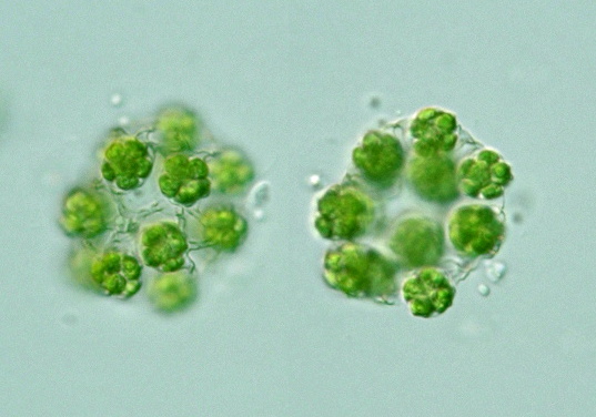 Species: Colonies of 8, 16, 32 or 64 cells, spherical in shape; cells spherical, covered by a delicate gelatinous sheath; sheaths with 5 or 6 short, stout, truncate processes radially projected and a single process toward the outer face of the cell; cells connected to adjacent ones by marginal processes of the sheath; intercellular spaces circular or triangular; cells 6-21 μm diam. (Photomicrographs of the Freshwater Algae, 1996).
