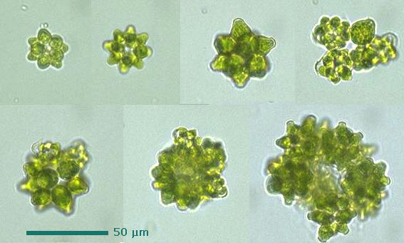 Family: Colonies of a fixed number of cells (4, 8, 16, 32, or more) arranged 2- or 3-dimensionally; cells spherical, ellipsoidal, polygonal, etc. in shape; chloroplasts 1 or several, plate-like in shape, with 1 pyrenoid; asexual reproduction by autocoenobium (Illustrations of The Japanese Fresh-water Algae, 1977).
