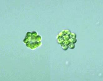 Coelastrum sphericum Nägeli var. sphericum: Colonies of 8, 16, or 32 cells, spherical or ovoid in shape; cells ovoid or cone-shaped, covered with a delicate gelatinous sheath; cells connected to one another by short gelatinous processes; inter cellular space small triangular; cells 6-25 μm diam. (Photomicrographs of the Freshwater Algae, 1996).