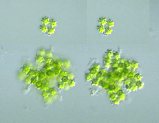 Species: Spherical colonies of 8, 16 or more cells within a gelatinous coat; cell body spherical 9-10 (-24) μm in diam., with 4-10 (-14) small truncate, wart-like processes; cells connected to adjacent ones by the basal stout processes (Photomicrographs of the Freshwater Algae, vol. 5, 1986).