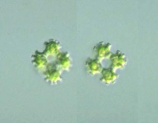 Species: Spherical colonies of 8, 16 or more cells within a gelatinous coat; cell body spherical 9-10 (-24) μm in diam., with 4-10 (-14) small truncate, wart-like processes; cells connected to adjacent ones by the basal stout processes (Photomicrographs of the Freshwater Algae, vol. 5, 1986).