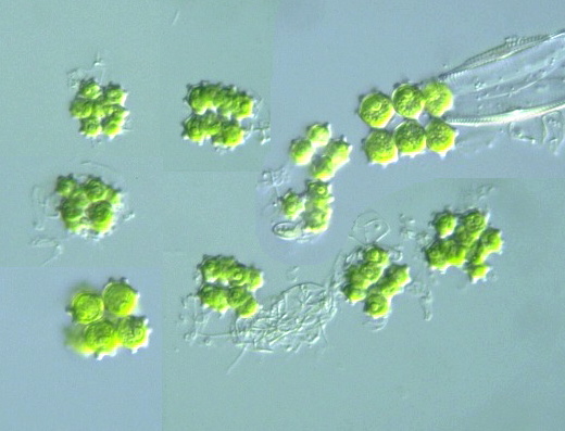 Species: Spherical colonies of 8, 16 or more cells within a gelatinous coat; cell body spherical 9-10 (-24) μm in diam., with 4-10 (-14) small truncate, wart-like processes; cells connected to adjacent ones by the basal stout processes (Photomicrographs of the Freshwater Algae, vol. 5, 1986).