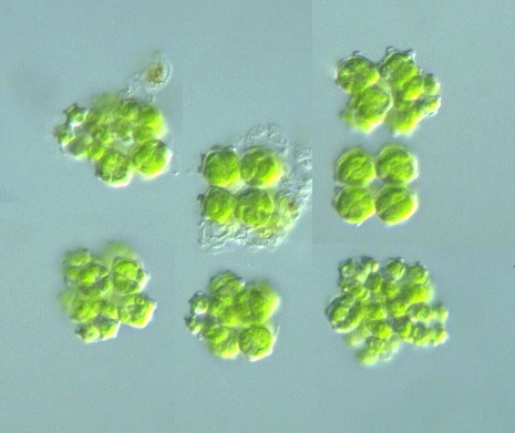 Species: Spherical colonies of 8, 16 or more cells within a gelatinous coat; cell body spherical 9-10 (-24) μm in diam., with 4-10 (-14) small truncate, wart-like processes; cells connected to adjacent ones by the basal stout processes (Photomicrographs of the Freshwater Algae, vol. 5, 1986).