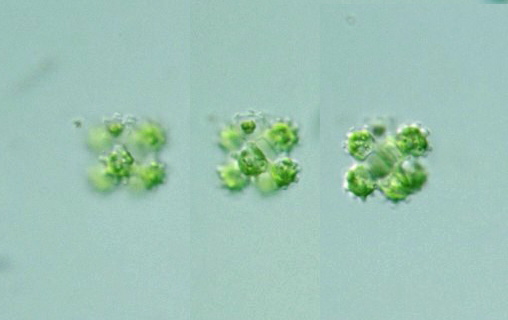 Species: Spherical colonies of 8, 16 or more cells within a gelatinous coat; cell body spherical 9-10 (-24) μm in diam., with 4-10 (-14) small truncate, wart-like processes; cells connected to adjacent ones by the basal stout processes (Photomicrographs of the Freshwater Algae, vol. 5, 1986).