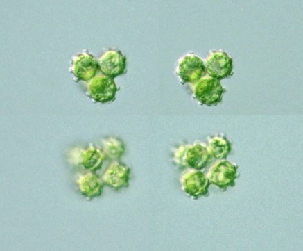 Species: Spherical colonies of 8, 16 or more cells within a gelatinous coat; cell body spherical 9-10 (-24) μm in diam., with 4-10 (-14) small truncate, wart-like processes; cells connected to adjacent ones by the basal stout processes (Photomicrographs of the Freshwater Algae, vol. 5, 1986).