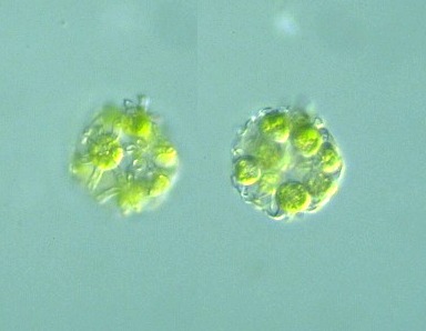 Species: Colonies of 8, 16, 32 or 64 cells, up to 100 μm in diam.; cell body spherical, with a small wart-like process, up to 15 μm in diam.; cells connected to adjacent cells by 1-3 strands; a single chloroplast parietal, plate-like, with a pyrenoid (Photomicrographs of the Freshwater Algae, vol. 8, 1988).
