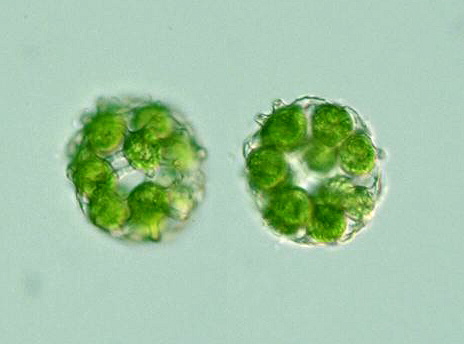 Species: Colonies of 8, 16, 32 or 64 cells, up to 100 μm in diam.; cell body spherical, with a small wart-like process, up to 15 μm in diam.; cells connected to adjacent cells by 1-3 strands; a single chloroplast parietal, plate-like, with a pyrenoid (Photomicrographs of the Freshwater Algae, vol. 8, 1988).