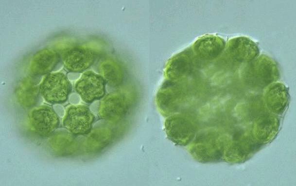 Species: Colonies of 8, 16 or 32 cells, spherical in shape, covered by a mucilaginous envelope; often held in multiple coenobia by the remains of mother cell walls; cells connected to adjacent ones by 5 - 7 long, slender processes; intercellular spaces large; cells up to 24 μm diam. (Photomicrographs of the Freshwater Algae, 1996).