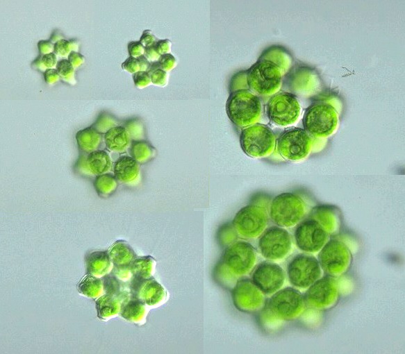 Species: Colonies of 8, 16 or 32 cells, spherical in shape, covered by a mucilaginous envelope; often held in multiple coenobia by the remains of mother cell walls; cells connected to adjacent ones by 5 - 7 long, slender processes; intercellular spaces large; cells up to 24 μm diam. (Photomicrographs of the Freshwater Algae, 1996).