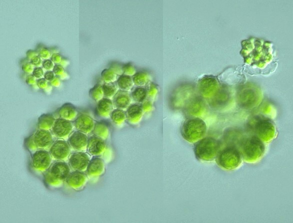 Species: Colonies of 8, 16 or 32 cells, spherical in shape, covered by a mucilaginous envelope; often held in multiple coenobia by the remains of mother cell walls; cells connected to adjacent ones by 5 - 7 long, slender processes; intercellular spaces large; cells up to 24 μm diam. (Photomicrographs of the Freshwater Algae, 1996).
