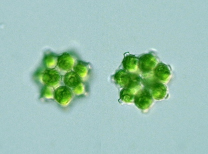 Species: Colonies of 8, 16 or 32 cells, spherical in shape, covered by a mucilaginous envelope; often held in multiple coenobia by the remains of mother cell walls; cells connected to adjacent ones by 5 - 7 long, slender processes; intercellular spaces large; cells up to 24 μm diam. (Photomicrographs of the Freshwater Algae, 1996).