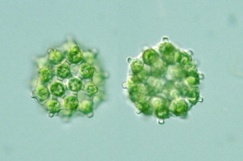 Species: Colonies of 8, 16 or 32 cells, spherical in shape, covered by a mucilaginous envelope; often held in multiple coenobia by the remains of mother cell walls; cells connected to adjacent ones by 5 - 7 long, slender processes; intercellular spaces large; cells up to 24 μm diam. (Photomicrographs of the Freshwater Algae, 1996).