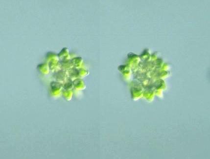 Species: Colonies of 8, 16, or 32 cells, spherical or ovoid in shape; cells ovoid or cone-shaped, covered with a delicate gelatinous sheath; cells connected to one another by short gelatinous processes; inter cellular space small triangular; cells 6-25 μm diam. (Photomicrographs of the Freshwater Algae, 1996).