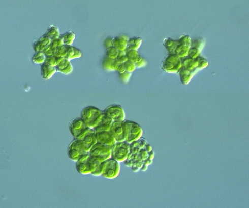 Species: Colonies of 8, 16, or 32 cells, spherical or ovoid in shape; cells ovoid or cone-shaped, covered with a delicate gelatinous sheath; cells connected to one another by short gelatinous processes; inter cellular space small triangular; cells 6-25 μm diam. (Photomicrographs of the Freshwater Algae, 1996).