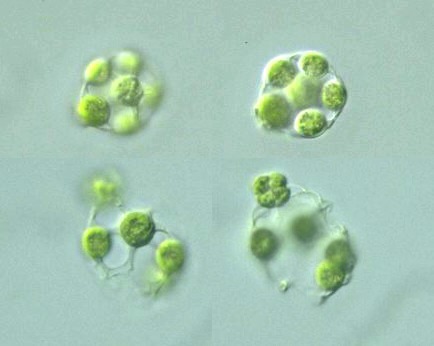 Family: Colonies of a fixed number of cells (4, 8, 16, 32, or more) arranged 2- or 3-dimensionally; cells spherical, ellipsoidal, polygonal, etc. in shape; chloroplasts 1 or several, plate-like in shape, with 1 pyrenoid; asexual reproduction by autocoenobium (Illustrations of The Japanese Fresh-water Algae, 1977).