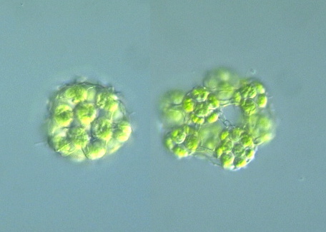 Species: Colonies of 8, 16, 32 or 64 cells, spherical in shape; cells spherical, covered by a delicate gelatinous sheath; sheaths with 5 or 6 short, stout, truncate processes radially projected and a single process toward the outer face of the cell; cells connected to adjacent ones by marginal processes of the sheath; intercellular spaces circular or triangular; cells 6-21 μm diam. (Photomicrographs of the Freshwater Algae, 1996).