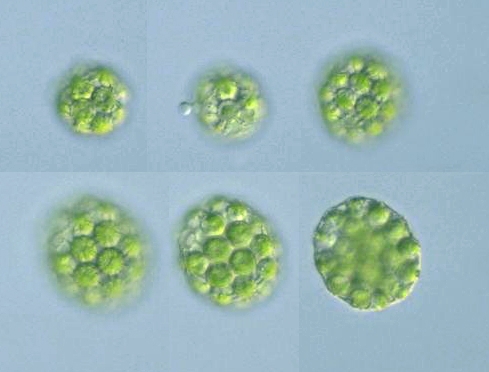Species: Colonies of 8, 16, 32 or 64 cells, up to 100 μm in diam.; cell body spherical, with a small wart-like process, up to 15 μm in diam.; cells connected to adjacent cells by 1-3 strands; a single chloroplast parietal, plate-like, with a pyrenoid (Photomicrographs of the Freshwater Algae, vol. 8, 1988).