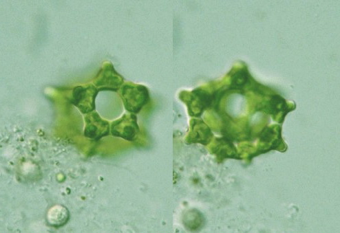 Coelastrum Species: Colonies of 4, 8, 16 or 32 cells, pyramidal, cubical or polygonal in shape; cells conical or tetrahedral in shape, sides concave, corners truncated, 6-17 μm in diam.; cells connected to adjacent cells by the projected corners forming a large polygonal space between the cells (Photomicrographs of the Freshwater Algae, vol. 2, 1984).