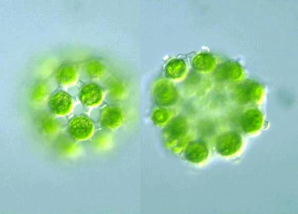 Species: Colonies of 8, 16 or 32 cells, spherical in shape, covered by a mucilaginous envelope; often held in multiple coenobia by the remains of mother cell walls; cells connected to adjacent ones by 5 - 7 long, slender processes; intercellular spaces large; cells up to 24 μm diam. (Photomicrographs of the Freshwater Algae, 1996).