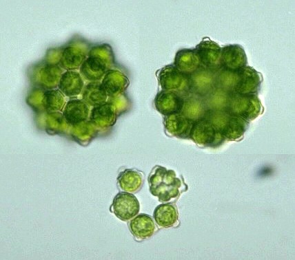 Species: Colonies of 8, 16 or 32 cells, spherical in shape, covered by a mucilaginous envelope; often held in multiple coenobia by the remains of mother cell walls; cells connected to adjacent ones by 5 - 7 long, slender processes; intercellular spaces large; cells up to 24 μm diam. (Photomicrographs of the Freshwater Algae, 1996).