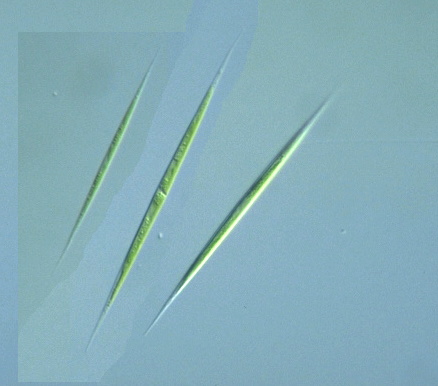 Monoraphidium Genus: Cell body elongated spindle in shape, straight or curved, sharply pointed at both ends; (Guide book to the "Photomicrographs of the Freshwater Algae", 1998).
