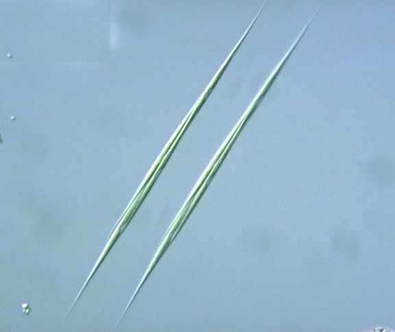 Monoraphidium Genus: Cell body elongated spindle in shape, straight or curved, sharply pointed at both ends; (Guide book to the "Photomicrographs of the Freshwater Algae", 1998).
