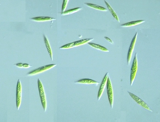 Monoraphidium litorale Genus: Cell body elongated spindle in shape, straight or curved, sharply pointed at both ends; (Guide book to the "Photomicrographs of the Freshwater Algae", 1998).