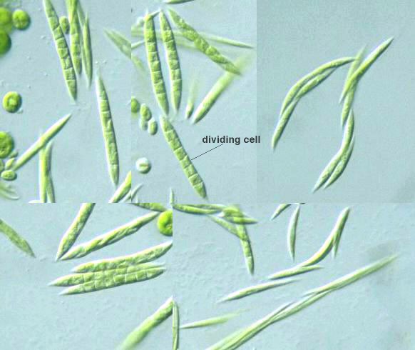 Monoraphidium litorale Genus: Cell body elongated spindle in shape, straight or curved, sharply pointed at both ends; (Guide book to the "Photomicrographs of the Freshwater Algae", 1998).