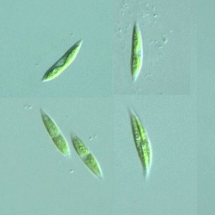 Species: Cell body fusiform, straight or slightly bowed, both ends tapered, 22-43 μm long, 2-6 μm wide; chloroplast parietal, elongated, with pyrenoids; cell division produces 4, 8, or 16 "autospores" (Photomicrographs of the Freshwater Algae, vol. 16, 1996).