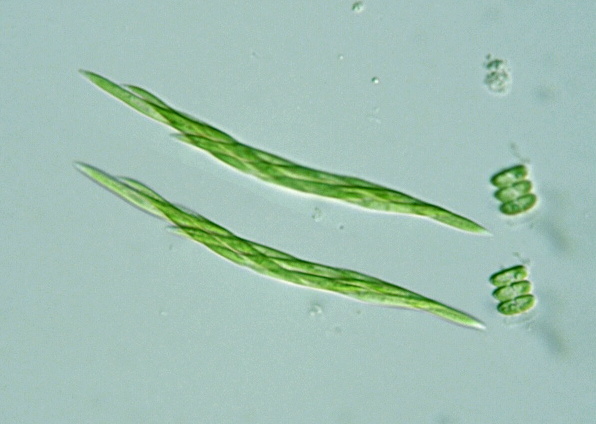 Monoraphidium Genus: Cell body elongated spindle in shape, straight or curved, sharply pointed at both ends; (Guide book to the "Photomicrographs of the Freshwater Algae", 1998).