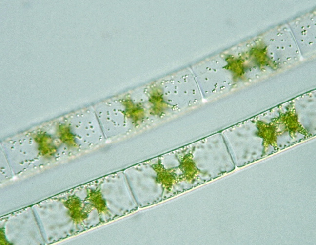 Zygnema Genus: Filament without branching; cell body cylindrical; two chloroplasts star-shaped; tubes formed (or cell body fused) at conjugation; zygospore spherical or broad ellipsoidal formed within female gametangium (Guide book to the "Photomicrographs of the Freshwater Algae", 1998).