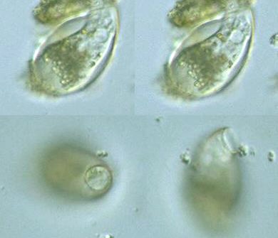 Cyphoderia truncata, test 44 μm long, 26 μm wide (diam.), pseudostome 11 μm in diam., x 400, x 640, Japan, 199? by Y. Tsukii