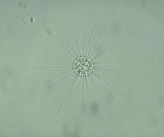 Actinophrys Genus (Ehrenberg, 1830): Spheroidal; cytoplasm vacuolated, especially ectoplasm; nucleus central; one to many contractile vacuoles; axopodia straight, axial filaments terminate at surface of the nucleus (Kudo, 1966).