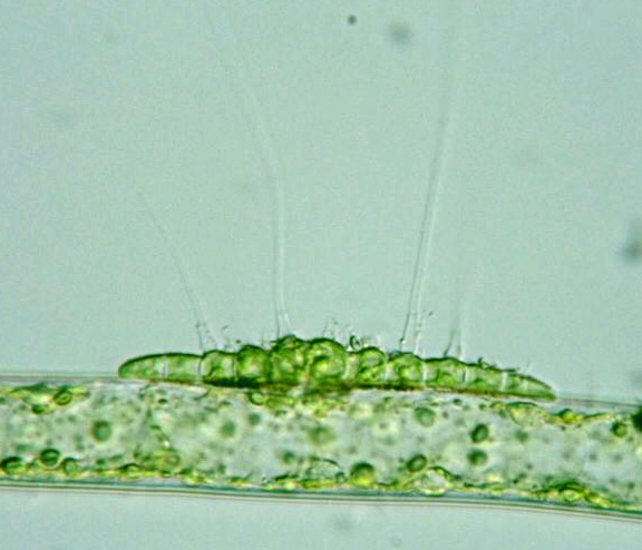 Aphanochaete repens Braun var. repens, cell body 10-13 μm long, 5-12 μm wide, hairlly projections more than 150 μm long, x 400, x 640, Fujimi-hotaru-shinsui Park, Okegawa city, Saitama Pref., Japan, March 21, 2006 by Y. Tsukii