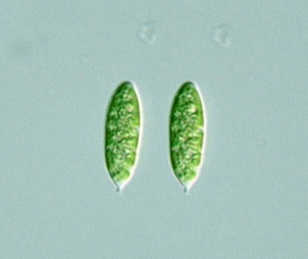 Characium Genus: Unicellular; cell body ellipsoidal or spindle-shaped, attached on a substrate at one end; a single chloroplast plate-like in shape, with a pyrenoid (Guide book to the "Photomicrographs of the Freshwater Algae", 1998).