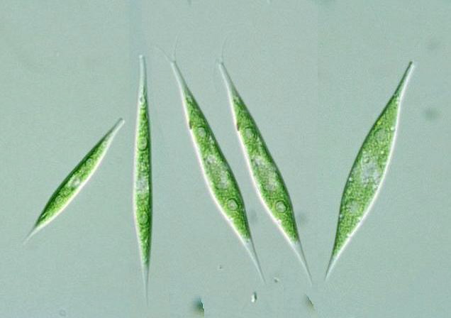 Species: Cell body fusiform or elongated ovoid, 20-53 μm long, tapered at both ends, cell wall thin, chloroplasts plate-like, with two large pyrenoids one located at anterior half and another at posterior half, stigma ovoid or pear-shaped, located at anterior 1/4-1/3 of the cell body, many contractile vacuoles (An Illustrated Guide to Freshwater Zooplankton in Japan, 2000).