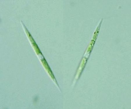 * Chlorogonium fusiforme Matvienko, 1938: Cell body fusiform, 16-27 μm long, not tapered at both ends, cell wall thin, chloroplasts plate-like, with a single pyrenoid located at the center of the cell body, stigma circular or ellipsoidal, located at anterior half of the cell body, many contractile vacuoles (An Illustrated Guide to Freshwater Zooplankton in Japan, 2000).