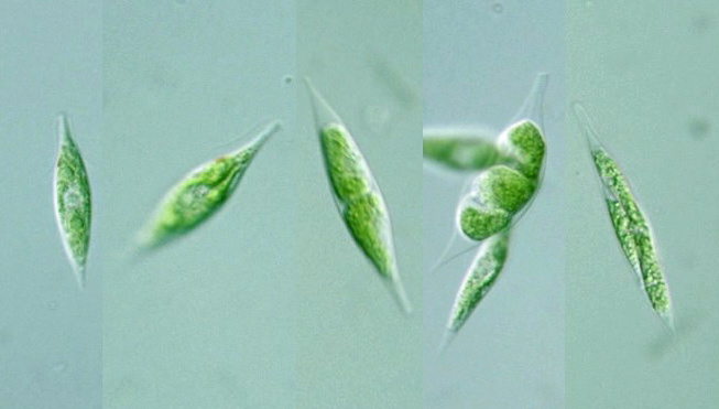 * Chlorogonium elongatum (Dangeard) Francé, 1897: Cell body fusiform or elongated ovoid, 20-53 μm long, tapered at both ends, cell wall thin, chloroplasts plate-like, with two large pyrenoids one located at anterior half and another at posterior half, stigma ovoid or pear-shaped, located at anterior 1/4-1/3 of the cell body, many contractile vacuoles (An Illustrated Guide to Freshwater Zooplankton in Japan, 2000).