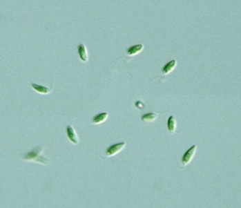 Chlorogonium Genus (Ehrenberg): Cells usually fusiform; both ends hyaline; two euqal-length flagella, about 1/2 as long as cell; eye spot present in most species; two or several contractile vacuoles; transverse division to form 4 zoospores; nutrition phototrophic or chemo-organotrophic (Illustrated Guide, 1985).