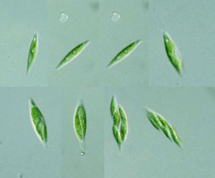 Chlorogonium Genus (Ehrenberg): Cells usually fusiform; both ends hyaline; two euqal-length flagella, about 1/2 as long as cell; eye spot present in most species; two or several contractile vacuoles; transverse division to form 4 zoospores; nutrition phototrophic or chemo-organotrophic (Illustrated Guide, 1985).