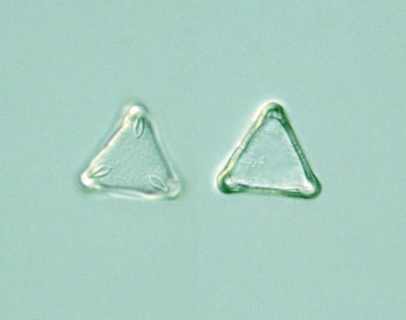Species: Cell body constricted in the middle, sinus narrow-linear part but acutely open outward, 11-22 μm long, 24-39 μm wide, L/W=2, constriction 21-28 μm wide; vertical view of cells triangular, sides straight, angles rounded; apex broad, with a short connecting process at each apical angle, excavated in the middle and forming a oblong hollow cavity between the adjacent cells; semicells transversely subrectangular, lateral margins obliquely truncate; filaments twisted (Photomicrographs of the Freshwater Algae, vol. 1, 1984).