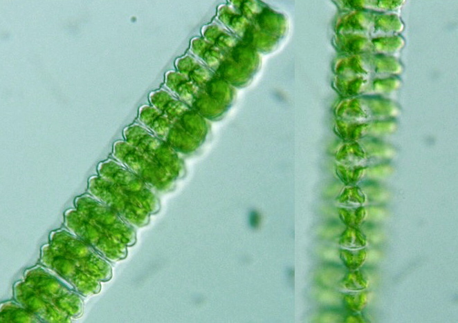 Desmidium swartzii Genus: Cell body short, with a deep constriction at the center, apical view fusiform or radially symmetrical; cell apexes without spiny projections; intermediate zone or folded structure appeared during cell division; zygospores remain within their mother cells (Illustrations of The Japanese Fresh-water Algae, 1977).