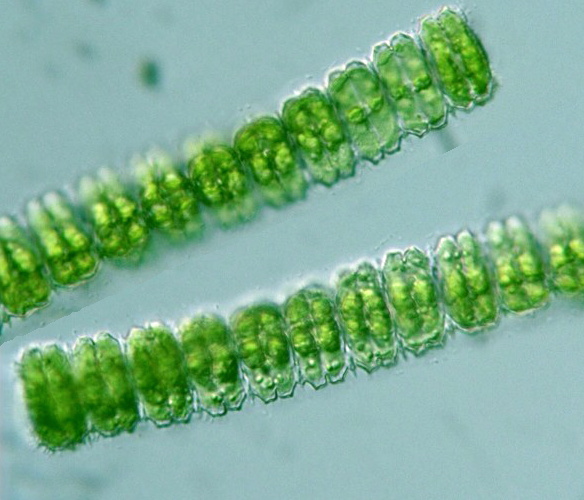 Desmidium swartzii Genus: Cell body short, with a deep constriction at the center, apical view fusiform or radially symmetrical; cell apexes without spiny projections; intermediate zone or folded structure appeared during cell division; zygospores remain within their mother cells (Illustrations of The Japanese Fresh-water Algae, 1977).