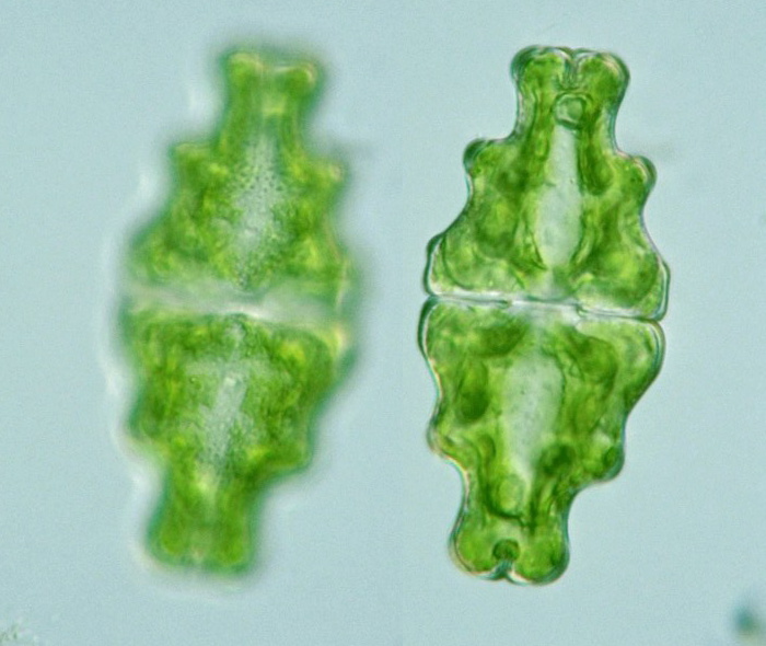 Species: Cell body elongated ellipsoidal, 98-117-(123) μm long, 53-64-(67) μm wide, L/W=2; semicells consisting of five lobes (one terminal, four lateral); bay opening between terminal and anterior lateral lobe is deep and narrow; anterior lateral lobes smaller than posterior one; posterior lobes with slight depressions; terminal lobe laterally extended and apically flattened; semicell with 5 bulges (2 anterior, 3 posterior), 1 pore present between the anterior bulges (Illustrations of The Japanese Fresh-water Algae, 1977).