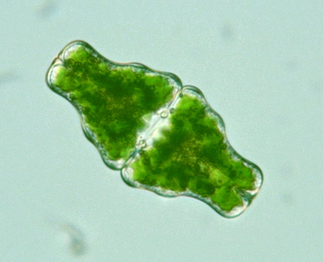 Euastrum ansatum var. javanicum (Gutwinski) Krieger, cell body 96 μm long, 46 μm wide, L/W=2.1, isthmus 11 μm wide, x 640, Kannon-numa Forest Park (pond), Shimogo town, Fukushima Pref., Japan, June 25, 2006, collected by Eizaburo Tsukii, photo by Y. Tsukii