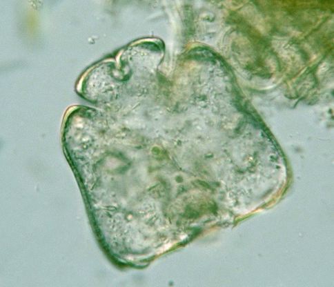 Section: Incisa (Cell surface smooth; apical area without spiny projections) Species: Cell body large, (158-162)-205 μm long, (81-84)-106 μm wide, L/W=2, isthmus (25-26)-30 μm wide; semicells rectangular in shape, each consisting of 3 lobes; lateral lobes large, elongate rectangular, slightly concaved; cell wall covered with small pores (Illustrations of The Japanese Fresh-water Algae, 1977).