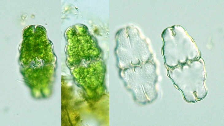 Euastrum gnathophorum Lenormand var. gnathophorum: Cell body 60-74 μm long, 34-46 μm wide, isthmus 8-15 μm wide, (Illustrations of the Fresh-water Algae, 1977).
