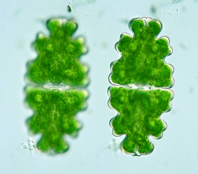 Species: Cell body elongated ellipsoidal, (115-162)-205 μm long, (60-78)-107 μm wide, L/W=2; semicells consisting of five lobes (one terminal, four lateral); bay opening between terminal and anterior lateral lobe is deeper and narrower than that between anterior and posterior lateral lobes; terminal lobe laterally extended forming fun-shaped structure; three spherical swellings at the base of semicells, with two additional swellings anteriorly (Illustrations of The Japanese Fresh-water Algae, 1977).